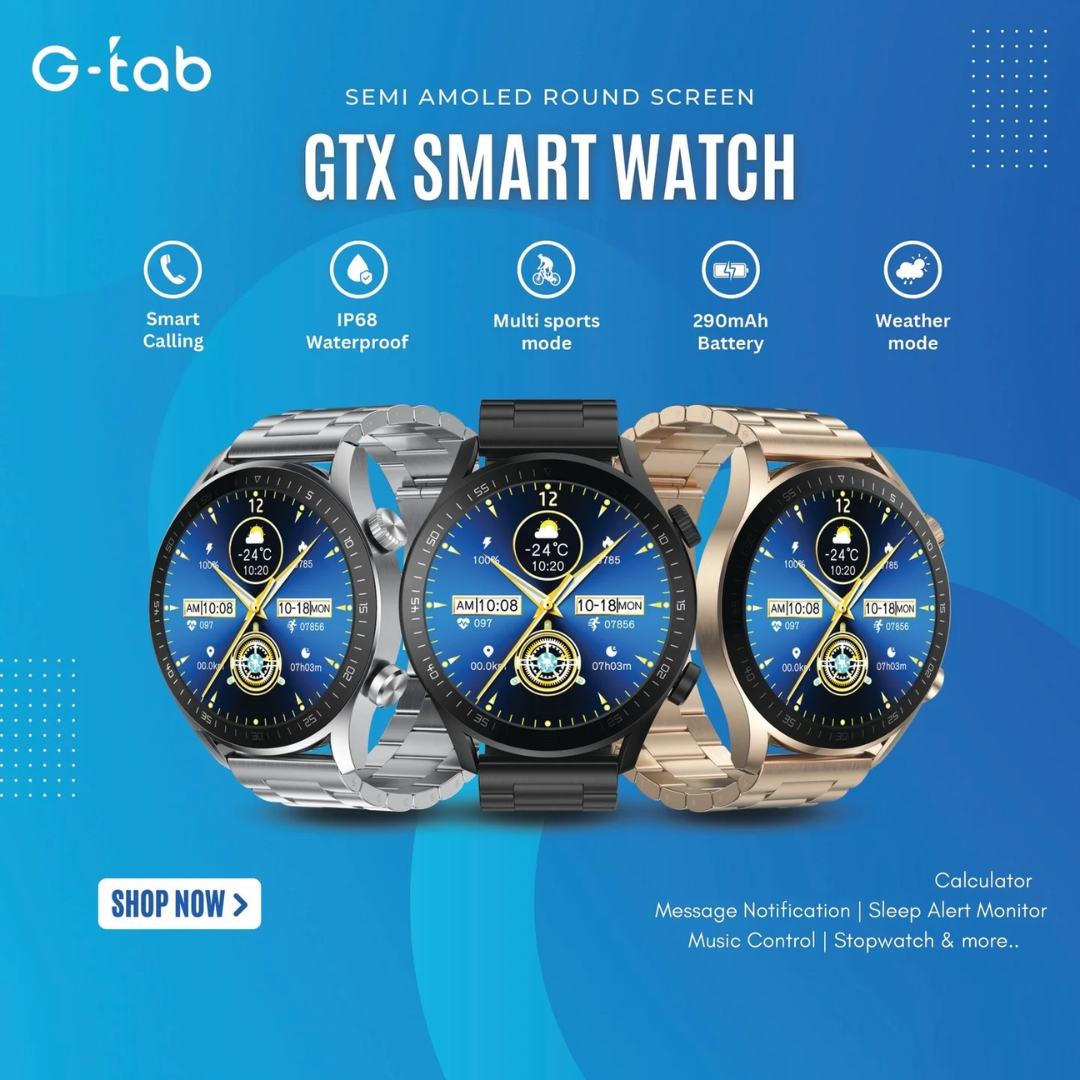 The G-Tab GTX is a stylish round smartwatch designed for daily use, fitness, and convenience. It features a 1.45-inch Semi-AMOLED round display that offers bright visuals and smooth touch interaction. The watch supports Bluetooth calling, allowing you to make and receive calls directly from your wrist when connected to your smartphone.